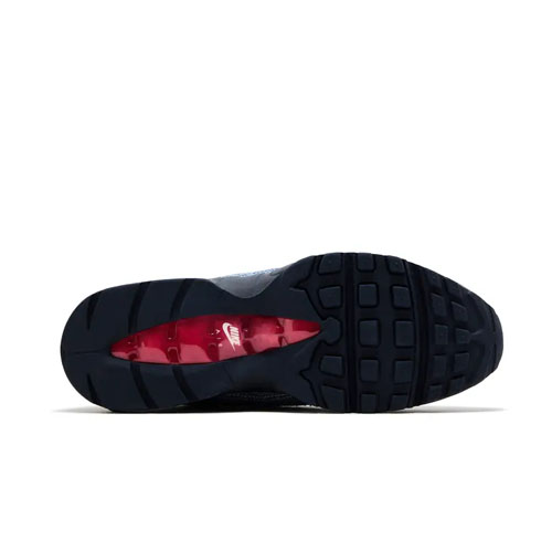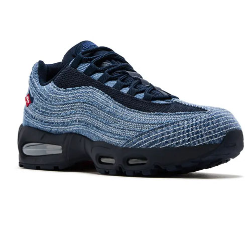 The Levi's x Nike Air Max 95 OG 'Obsidian' sports a dark navy foam midsole equipped with forefoot and heel Max Air units. The pre-washed, indigo-hued denim upper gets white contrast stitching and frayed edges. The insoles rock a Levi's logo, while the red tab joins a small Swoosh on the heel.