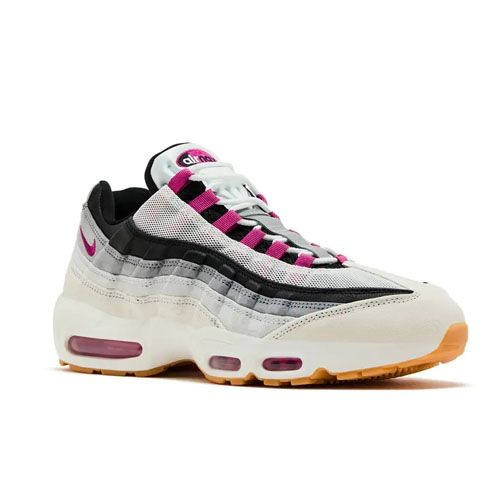 The Nike SB x Nike Air Max 95 'Cactus Flower' dons a white foam midsole equipped with hot pink Max Air units and anchored by a modified gum rubber outsole. These skate-inspired kicks have navy suede side panels with a gradient design that makes the black top layer go into lighter shades of grey. Fuchsia pops arrive on the webbed eyelets, embroidered Swoosh, and the embossed Nike SB logo on the reflective silver heel panel.