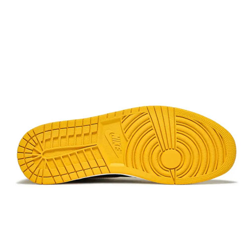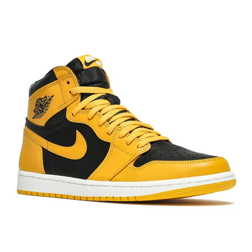 Emerging with a look similar to the 'Iowa' Dunk from 1985, the Air Jordan 1 Retro High OG 'Pollen' sports familiar color-blocking. Built with leather, the shoe's upper appears with a black base, overlaid by contrasting Pollen, including on the Swoosh branding. A nylon tongue supports the fit, as doe perforations on the toe box. Underfoot, a white Air midsole offers cushioning, giving way to a concentric rubber outsole for traction.