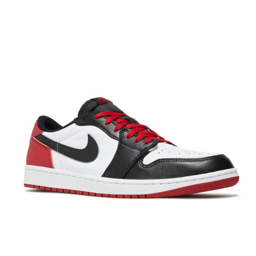 The Air Jordan 1 Retro Low OG 'Black Toe' of 2023 revives a popular original color scheme from 1985. The low-cut shape showcases a leather exterior with black and Varsity Red overlays on the forefoot and heel, respectively, against a white backdrop. The design also features a black Swoosh, a black Wings logo on the red leather heel patch and a Nike tongue label. A sturdy cupsole underfoot pairing white sidewalls with a red rubber outsole for optimal traction.